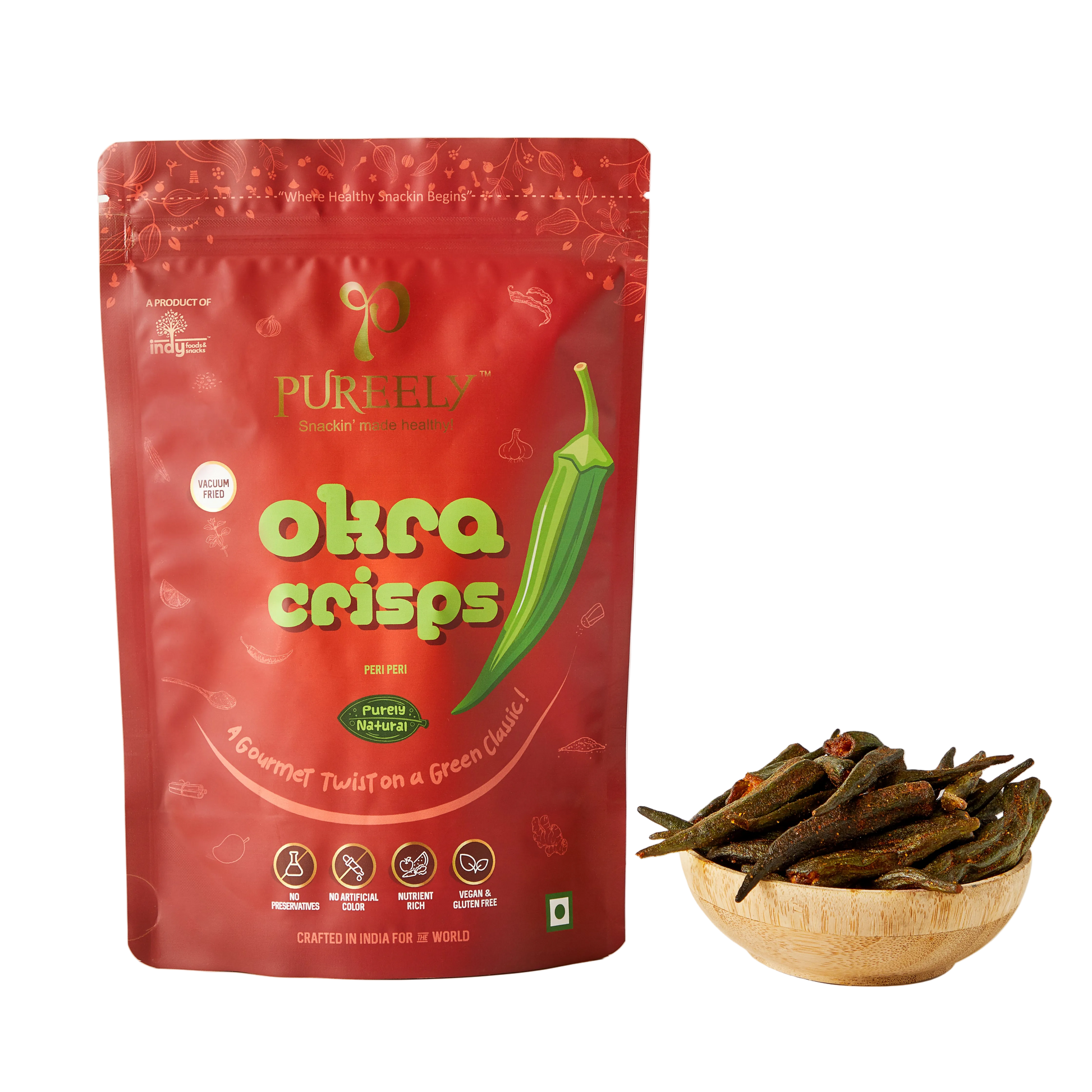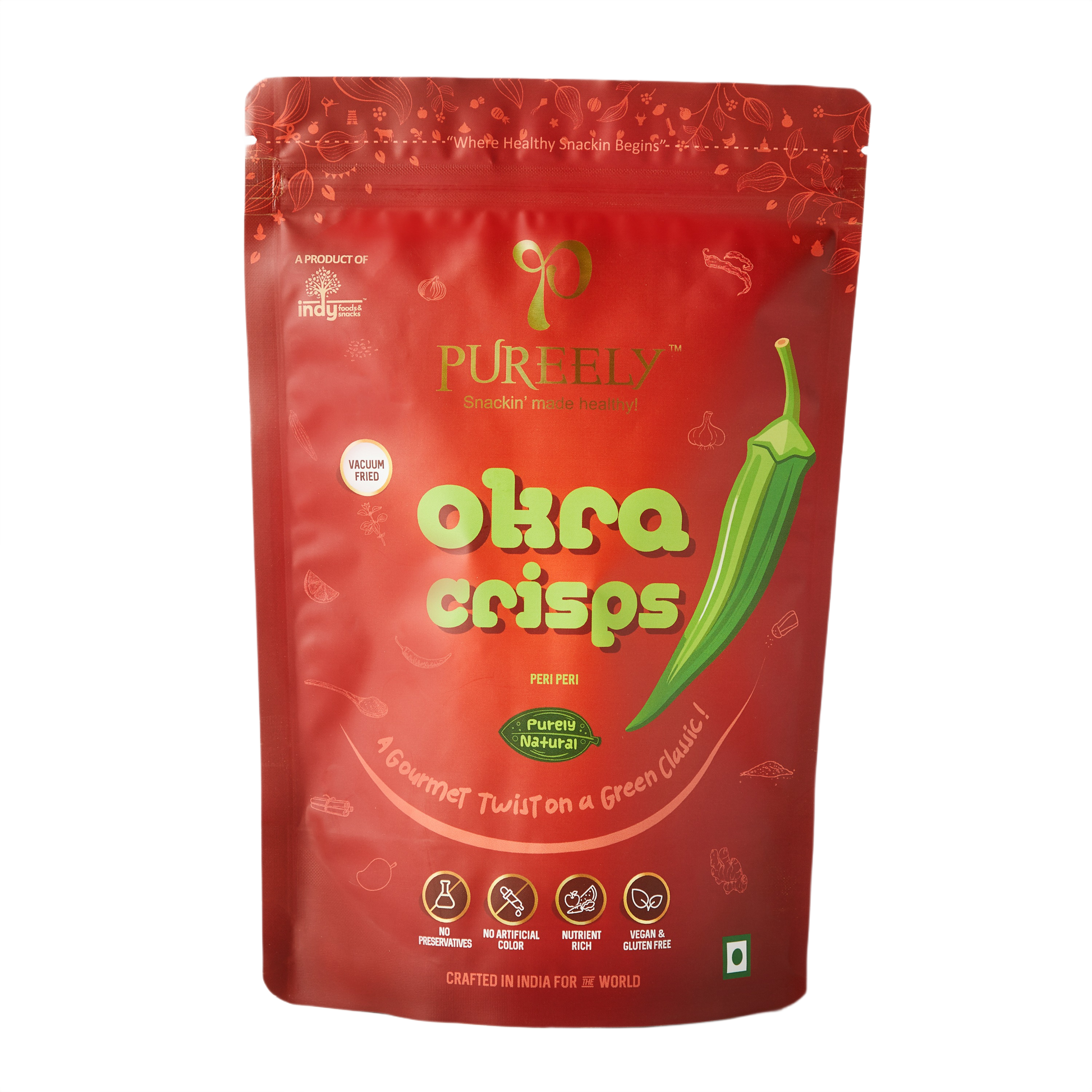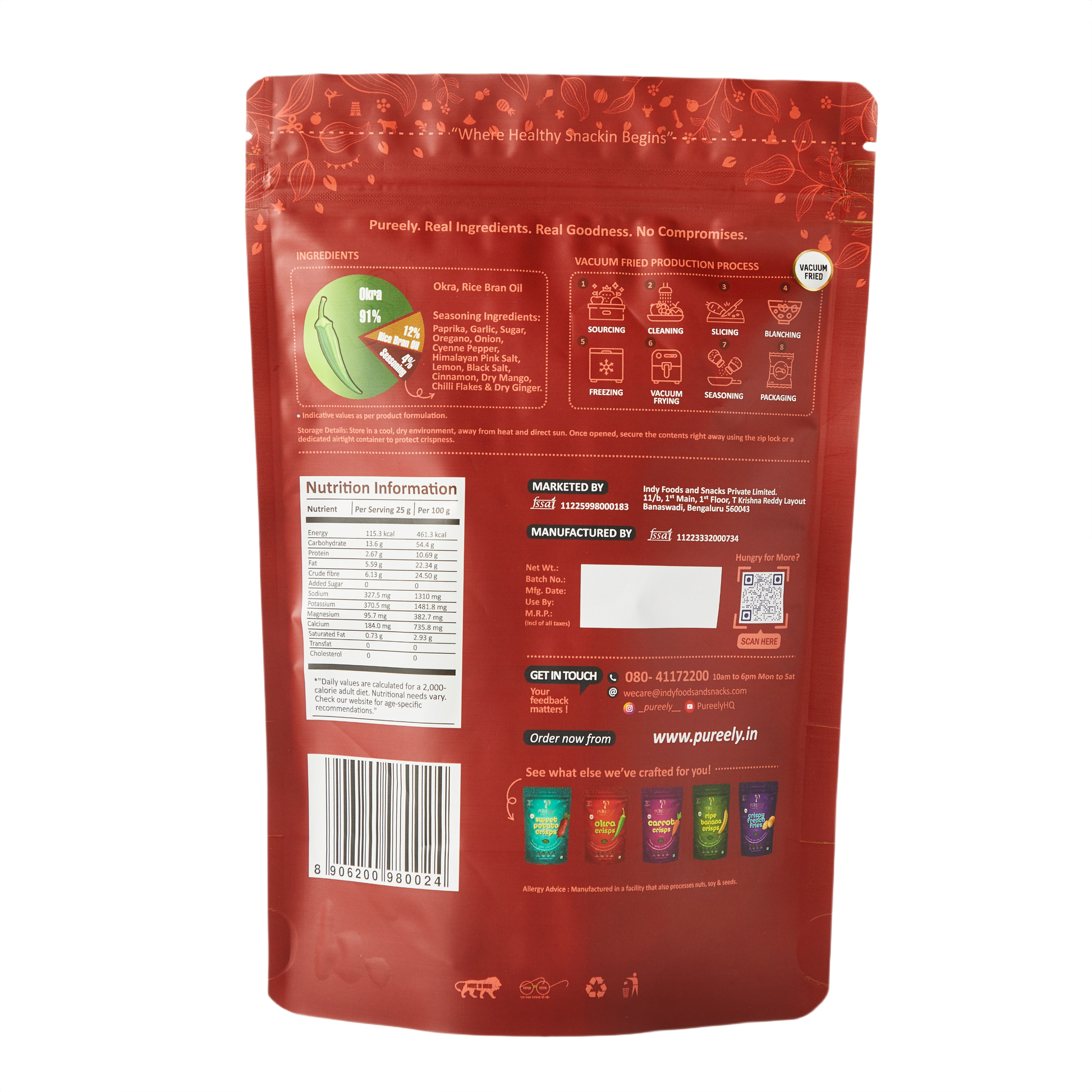 Crafted from hand-picked, farm-fresh okra pods which are at their tenderest. A nutrient-dense superfood, okra is full of fibre, vitamins, and antioxidants. Our Okra Crisps are not your typical chips. We transform this unassuming vegetable into a light, crunchy treat with no greasiness or stickiness and complete guilt-free satisfaction by using delicate vacuum frying and clean seasoning.