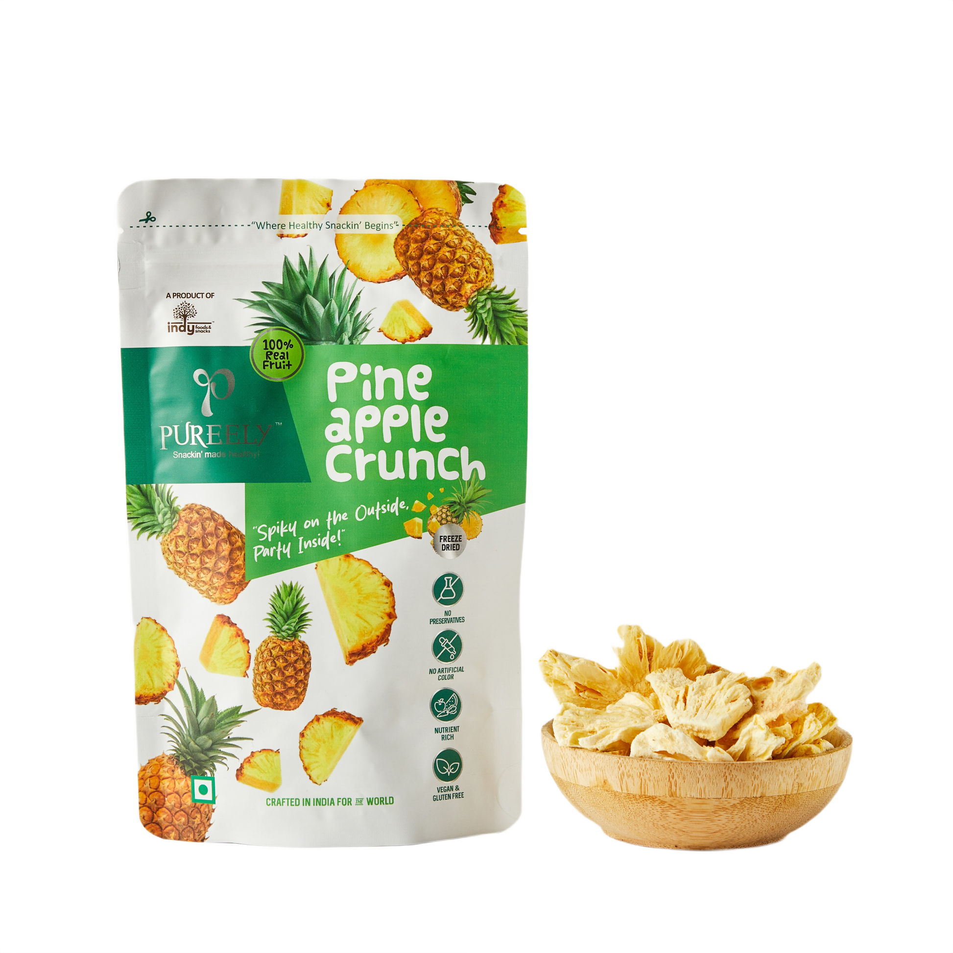 Crafted from Pineapples that are naturally ripened are hand-picked for their juicy sweetness, and tropical flavour are naturally ripened. These are carefully processed to create a light, crunchy snack that retains freshness and nutrients. Rich in Vitamin C, antioxidants, and bromelain, that help in digestion and immunity.